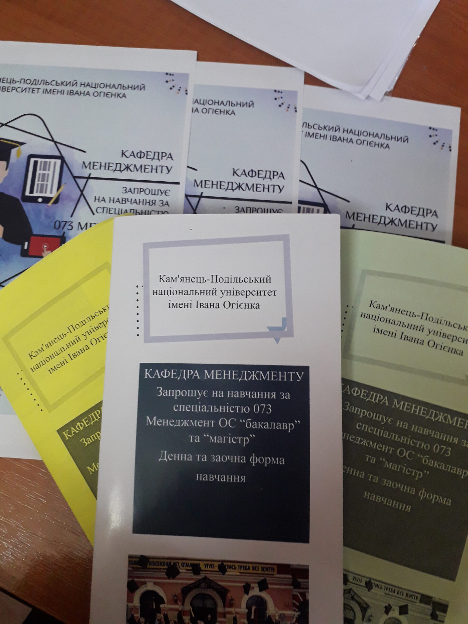 24 вересня 2021 року відбулася зустріч з учнями старших класів Кам’янець-Подільської ЗОШ № 10, на якій завідувач кафедри менеджменту Лисак В.Ю. ознайомив з особливостями навчання спеціальності 073 Менеджмент. При цьому старшокласникам роз’яснено подальші можливості сфери працевлаштування випускників, переваги професії менеджера з персоналу та формування спеціальних (фахових) компетентностей. Для підвищення інтересу до спеціальності було представлено інформаційні буклети та флаєра щодо орієнтації в професійній діяльності.