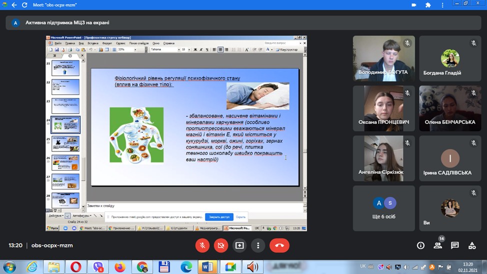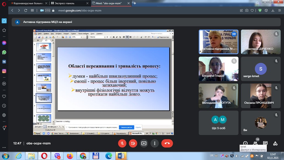 2 листопада 2021 року студенти першого курсу спеціальності 073 Менеджмент під керівництвом доцента кафедри Олійник Н.Ю. під час дистанційного проведення заняття з теми «Управління трудовими конфліктами в організації» мали змогу брати участь у тренінгу «Як підвищити власну стресостійкість», який провела провідний фахівець з профорієнтації міського центру зайнятості Ільєва Н.М.