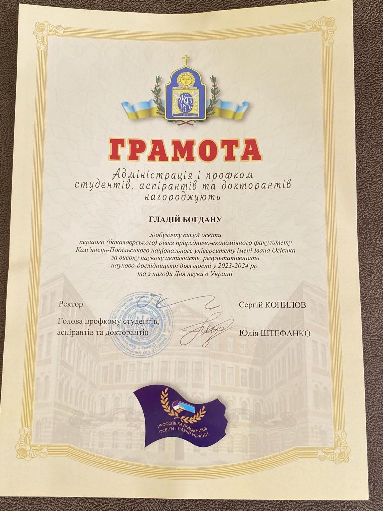 За високу наукову активність, результативність науково-дослідної діяльності у 2023-2024 рр. та з нагоди Дня науки в Україні нагороджено здобувачку вищої освіти першого (бакалаврського) рівня Богдану ГЛАДІЙ Грамотою від адміністрації і профкому студентів, аспірантів та докторантів.
