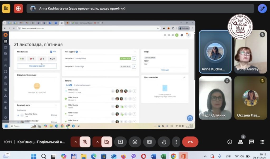 Зустріч-презентація з викладачами кафедри менеджменту Камʼянець-Подільського національного університету імені Івана Огієнка та Анною Кудрявцевою, Customer Success Manager HURMA System, була присвячена обговоренню сучасних інструментів цифровізації процесів управління персоналом. Під час зустрічі було представлено ключові можливості платформи Hurma System як комплексного HRM-рішення, що поєднує автоматизацію рекрутингу, управління талантом, аналітику HR-процесів та системи внутрішніх комунікацій.