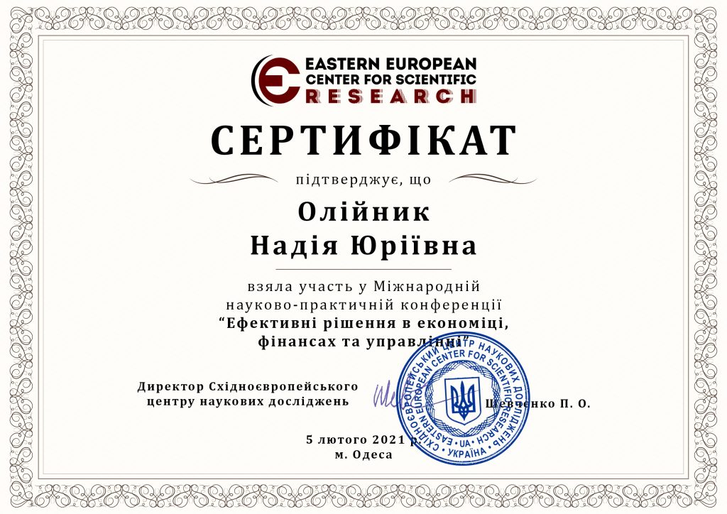 - Доцент Олійник Н.Ю. прийняла участь у Міжнародній науково-практичній конференції «Ефективні рішення в економіці, фінансах та управлінні» (5 лютого 2021 року, м. Одеса), організатором виступив Східноєвропейський центр наукових досліджень.