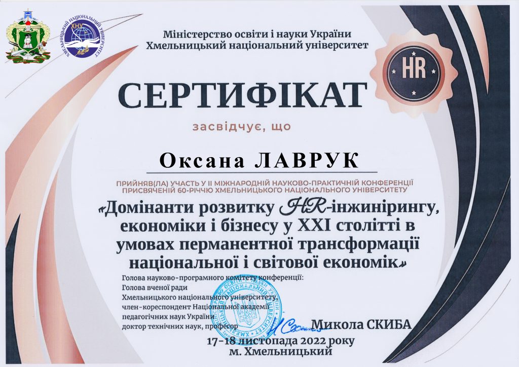 - Науково-педагогічні працівники кафедри Лисак В.Ю., Лаврук О.С. та Олійник Н.Ю. прийняли участь у ІІ Міжнародній науково-практичній конференції присвяченій 60-річчю Хмельницького національного університету «Домінанти розвитку HR-інжинірингу, економіки і бізнесу у ХХІ столітті в умовах перманентної трансформації національної і світової економік» (17-18 листопада, 2022 року, м. Хмельницький), з напряму проблематики і концептуальних підходів ефективного використання інструментів і методів менеджменту в умовах масштабної економічної кризи.