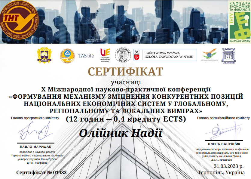 - Доцент Олійник Н.Ю. брала участь у X Міжнародної науково-практичної конференції «Формування механізму зміцнення конкурентних позицій національних економічних систем у глобальному, регіональному та локальних вимірах», що відбулася 31 березня, 2023 року, за сприянням Тернопільського національного технічного університету імені Івана Пулюя, Вроцлавського економічного університету «Опольська Політехніка», Університету прикладних наук в Нисі Індо-Європейська освітня фундація (Республіка Польща), Університеті Дунареа де Йос м. Галац (Румунія). Надія Олійник висвітлила проблеми в тематиці роботи конференції з майбутньої конкурентноспроможності: розумного управління, розумної території, розумного бізнесу.