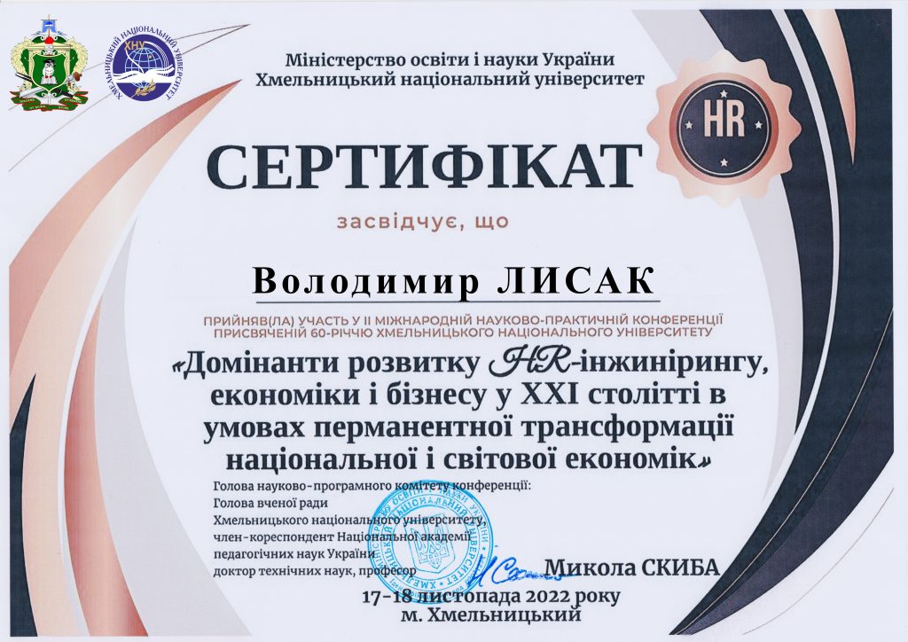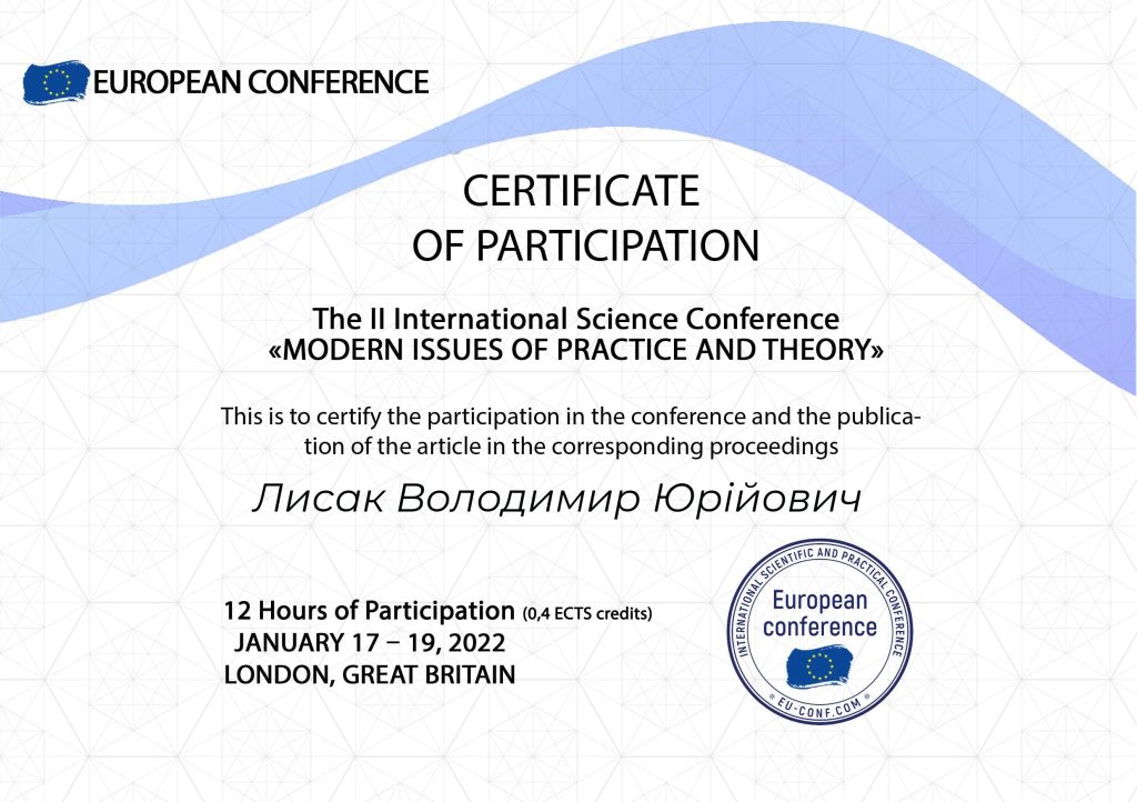 - Завідувач кафедри, доцент Лисак В.Ю. брав участь у ІІ Міжнарожній науковій конференції “Сучасні питання практики і теорії” та отримав сертифікат, що засвідчує участь та публікацію статті у відповідних збірниках (12 годин (0,4 кредиту ECTS).