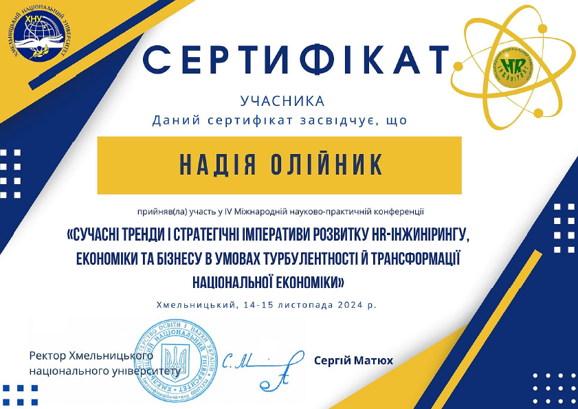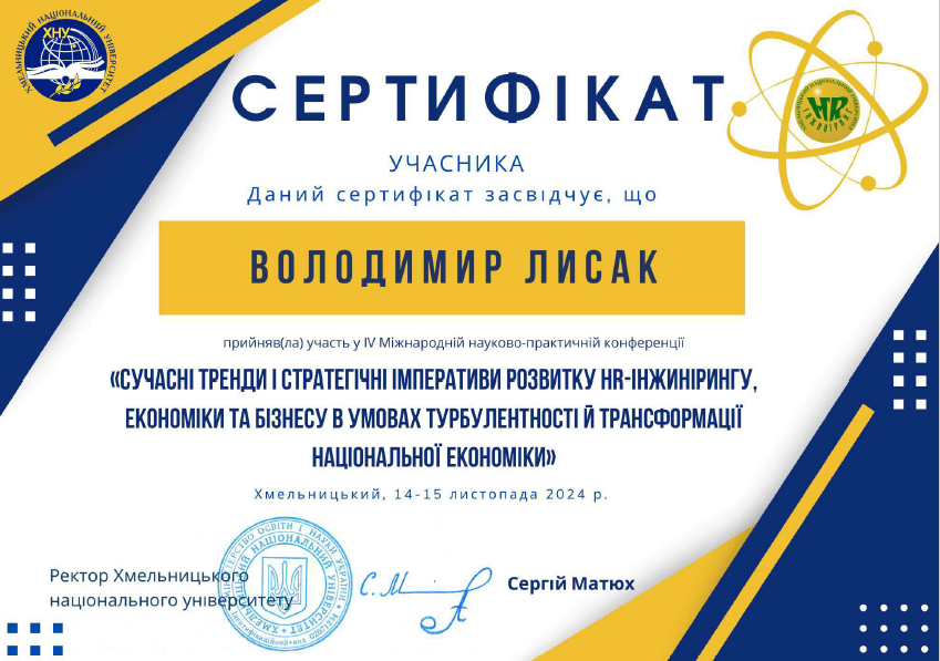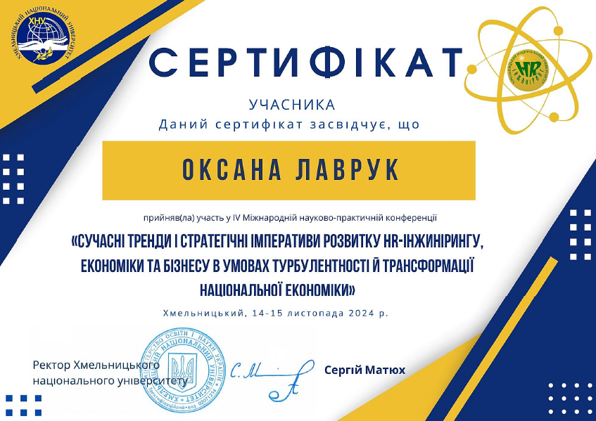 - Викладачі кафедри доцент Оксана ЛАВРУК, доцент Володимир ЛИСАК, доцент Надія ОЛІЙНИК брали участь у IV Міжнародній науково-практичній конференції «Сучасні тренди і стратегічні імперативи розвитку HR- інжинірингу, економіки та бізнесу в умовах турбулентності й трансформації національної економіки», що була проведена 14-15 листопада 2024 року кафедрою HR-інжиніринг у бізнес-економіці Хмельницького національного університету Проведено філософське осмислення інноваційної парадигми розвитку України у повоєнний період за умов трансформаційної біфуркації економіки, бізнесу та HR-інжинірингу; запропоновано синергізм інтеграції освіти, економіки, бізнесу та HR-інжинірингу; економіка та політика в Україні: виклики, загрози, детермінанти, шляхи вирішення; досліджено актуальні проблеми теорії, практики і подальшого розвитку менеджменту, маркетингу, фінансів і банківської справи, аудиту та оподаткування в умовах диджиталізації, глобалізації економіки та євро інтеграційних прагнень України.
