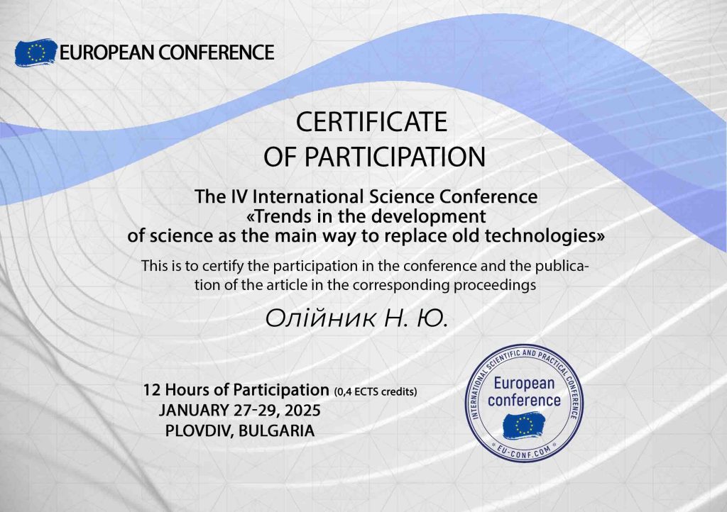 Доцент кафедри Надія ОЛІЙНИК брала участь у IV Міжнародній науково-практичній конференції «Trends in the development of science as the main way to replace old technologies», що відбулася 27-29 січня 2025 року, м. Пловдів, Болгарія. Викладач проаналізувала актуальні проблеми розвитку комунікативних мереж в менеджменті, що набуває важливого значення в управлінні на різних щаблях взаємодії персоналу та забезпечує ефективний інформаційний обіг без істотних втрат чи спотворень змісту, оскільки основним ресурсом менеджменту є інформація, а технологічною складовою – комунікація.