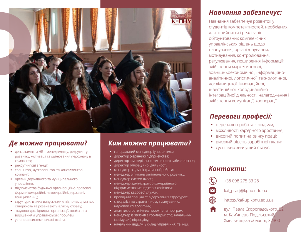 Працевлаштування на підприємствах будь-якої організаційно-правової форми (комерційні, некомерційні, державні, муніципальні), в яких випускники працюють у якості керівників або виконавців різноманітних служб апарату управління; департаменти НR – менеджменту, рекрутингу, розвитку, мотивації та оцінювання персоналу в компаніях; рекрутингові агенції; тренінгові, аутсорсингові та консалтингові компанії; органи державного та муніципального управління; структури, в яких випускники є підприємцями, що створюють та розвивають власну справу; науково-дослідницькі організації, пов’язані з вирішенням управлінських проблем; установи системи вищої освіти.